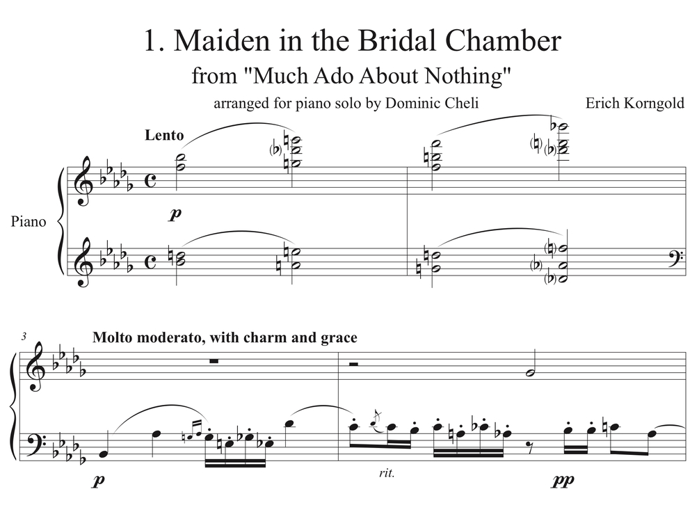 This is the full version of "4 Scenes from Much Ado About Nothing" composed by Erich Korngold and arranged for Piano Solo by Dominic Cheli.
